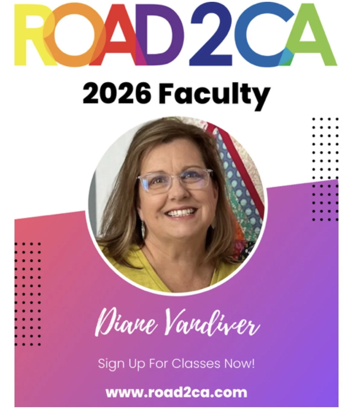 Road 2 CA… Travel Aug 19 Written By Diane Vandiver See my teaching schedule HERE at the Road 2 CA website.I’m so excited to be part of this amazing event! Please visit the website to see all of the information for planning your visit!Diane Diane Vandiver